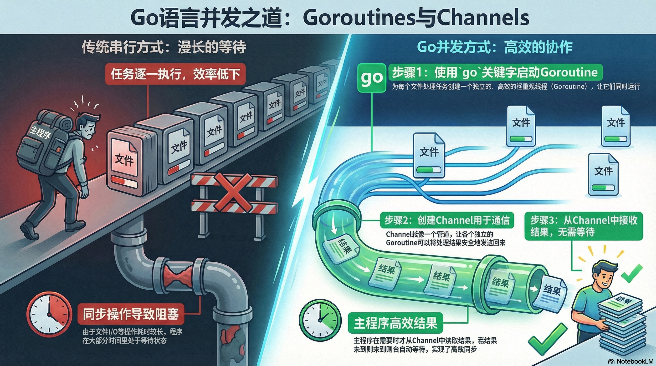 本文介绍了 Go 语言 如何通过其核心机制实现高效的并发编程。对比了传统同步处理文件的低效性,并展示了如何利用 Goroutines 这种轻量级线程来独立执行多个任务。为了管理这些并发操作,程序使用 Channels 作为数据通信的管道,在不同任务之间安全地传递结果。这种设计允许程序在数据准备就绪前自动阻塞等待,从而简化了复杂的异步逻辑。通过结合这两大特性,开发者可以更轻松地构建高性能且结构简洁的应用程序。